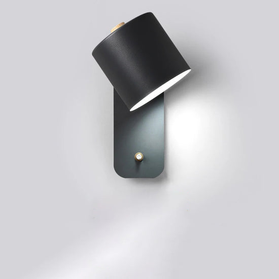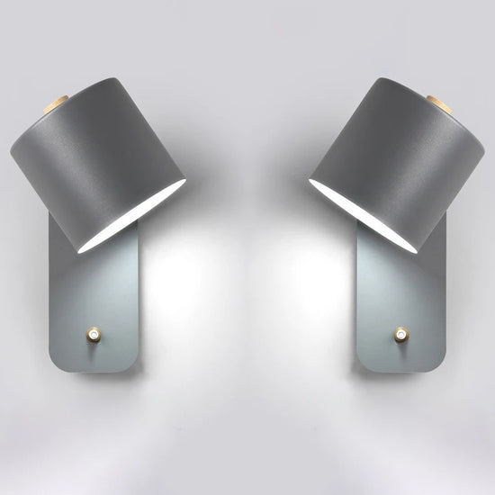 Applique murale grise en métal et bois, luminaire mural LED scandinave orientable au design moderne pour chambre ou salon.