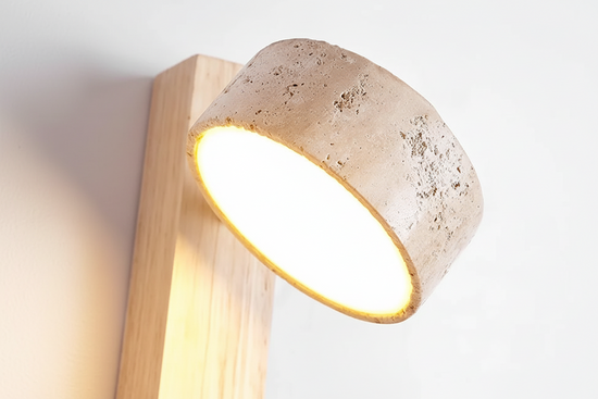 - Applique murale design mêlant bois naturel et pierre beige pour une esthétique chaleureuse