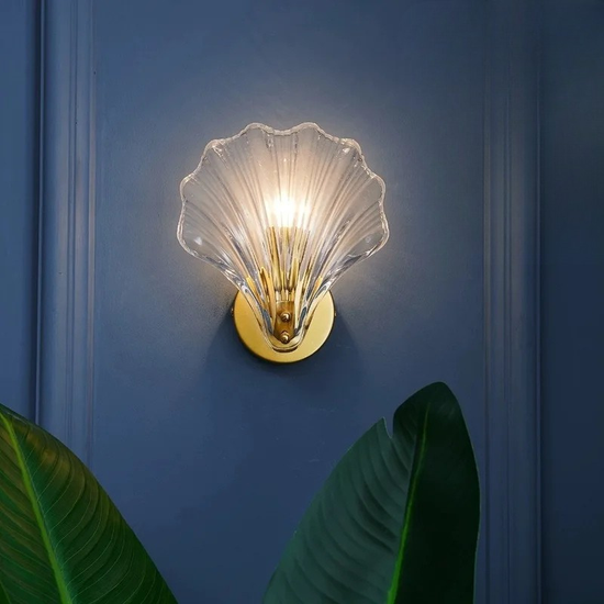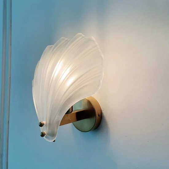 Applique murale coquillage en verre sculpté et laiton doré, luminaire mural design raffiné pour salon ou chambre élégante.